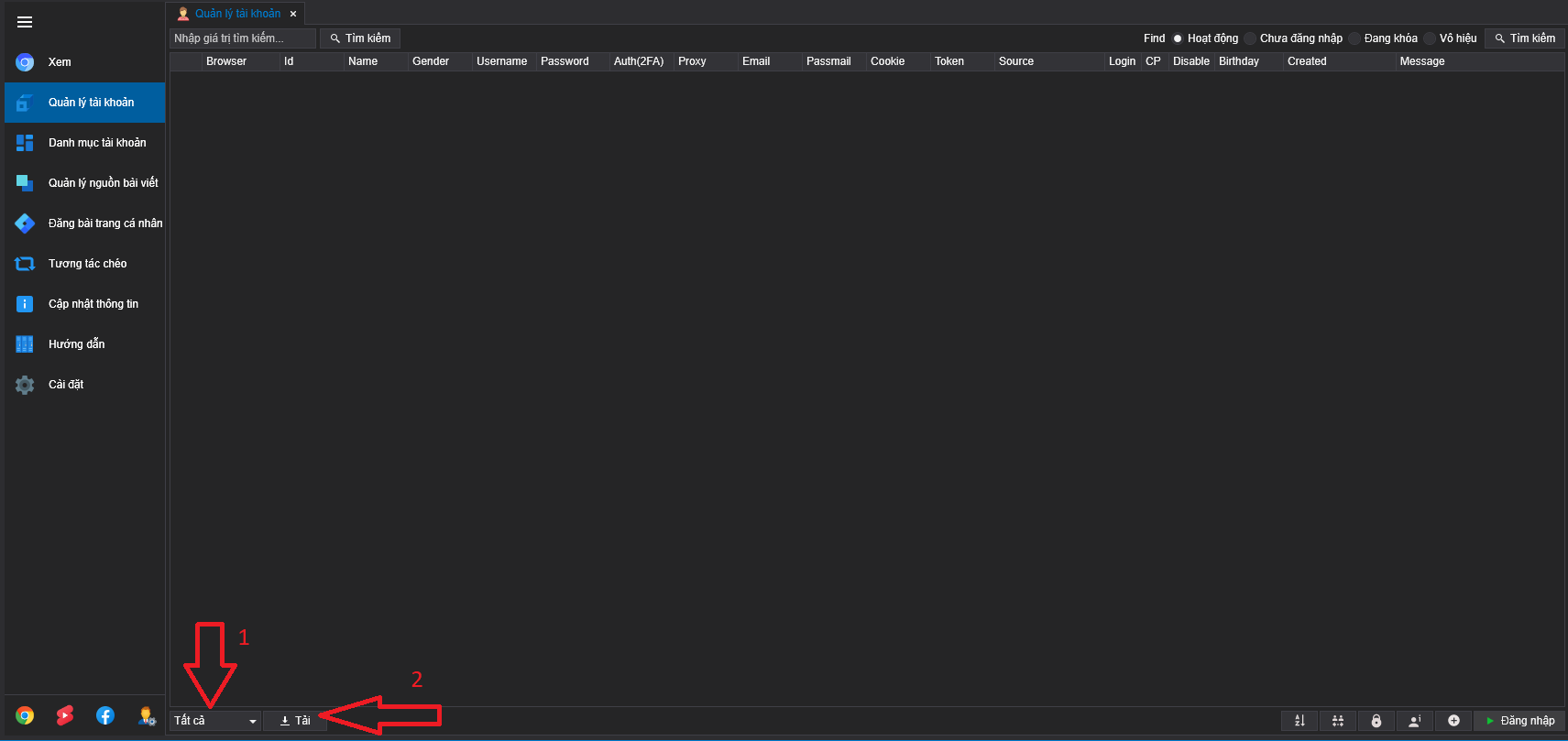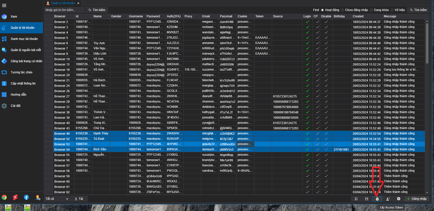 * Chọn vào tài khoản đang muốn lấy Token và click vào ô Lấy Acces Token là hoàn thành.