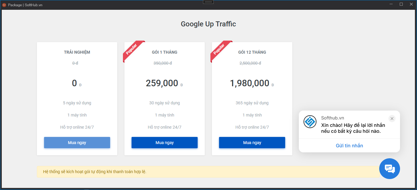 * Hiển thị các tùy chọn về bảng giá của phần mềm