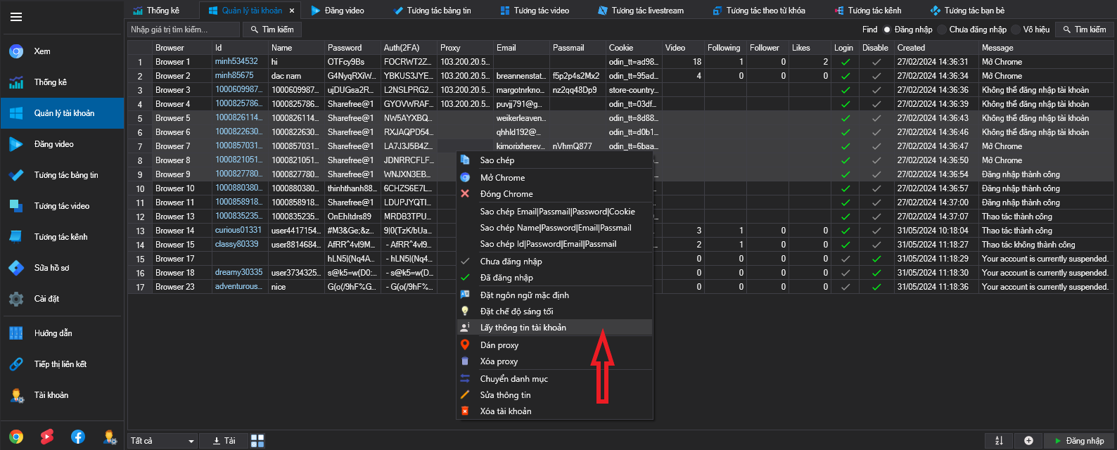 Chọn các tài khoản muốn lấy thông tin, rồi click chuột phải chọn tình năng "Lấy thông tin tài khoản".