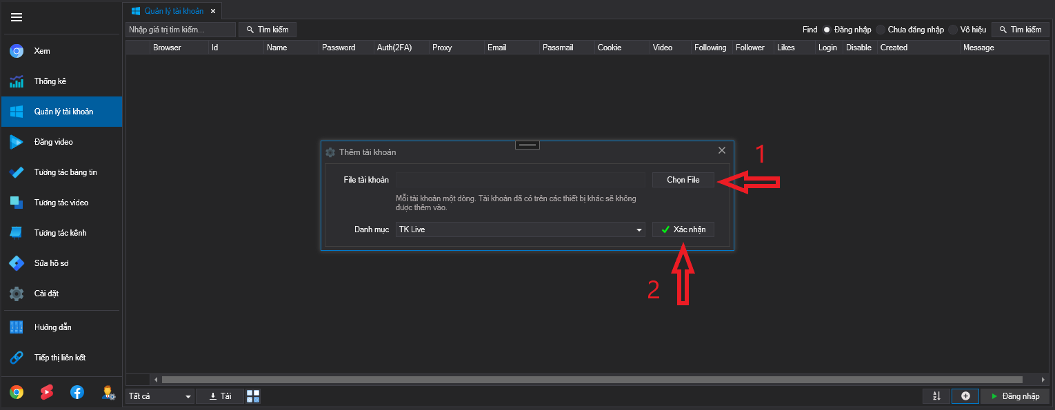 Click ô Chọn file và tìm đến nơi chứa file tài khoản để gán vào phần mềm.