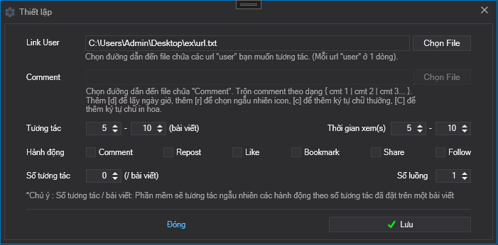 * Phần mềm sẽ tương tác các bài viết của các user được chỉ định như người dùng thật